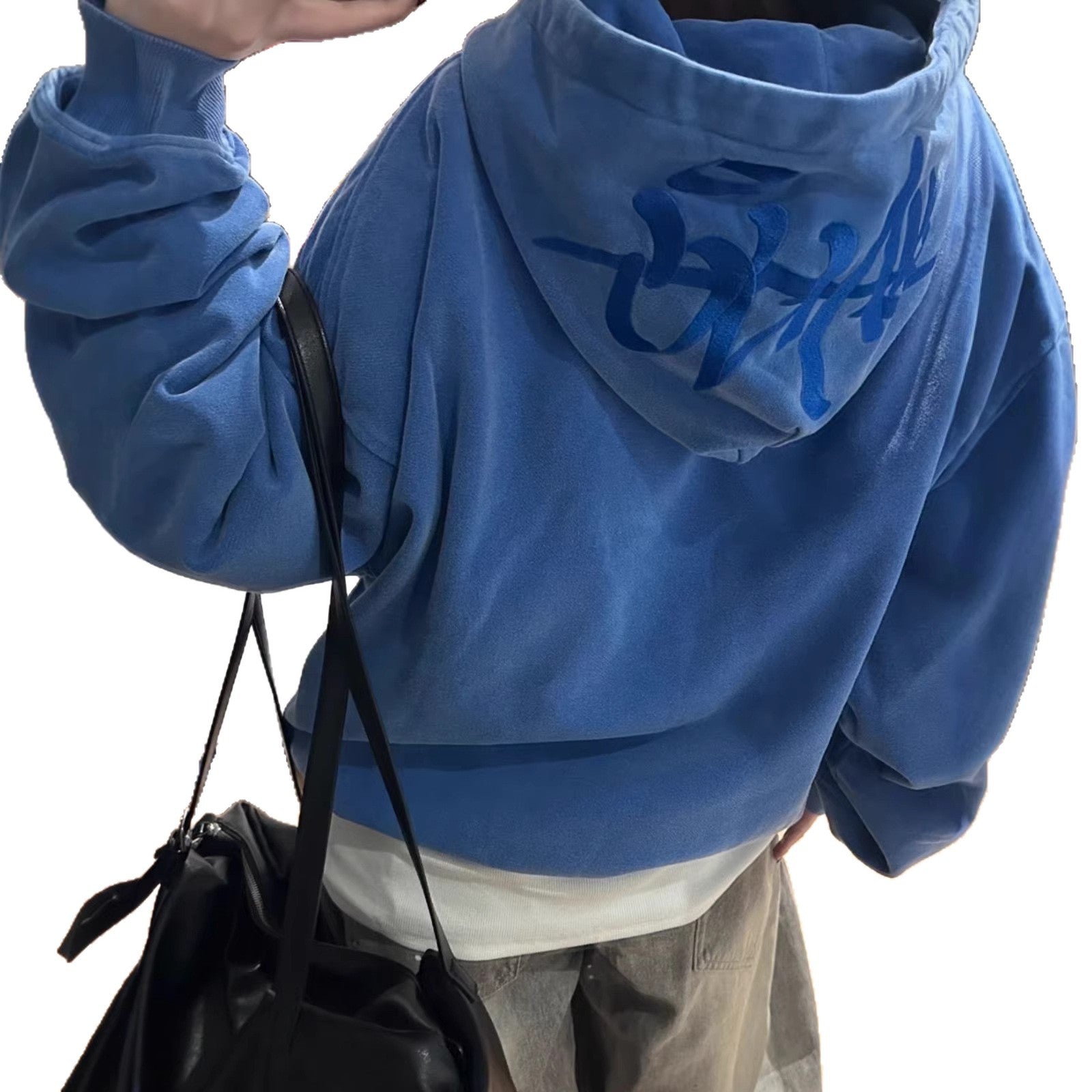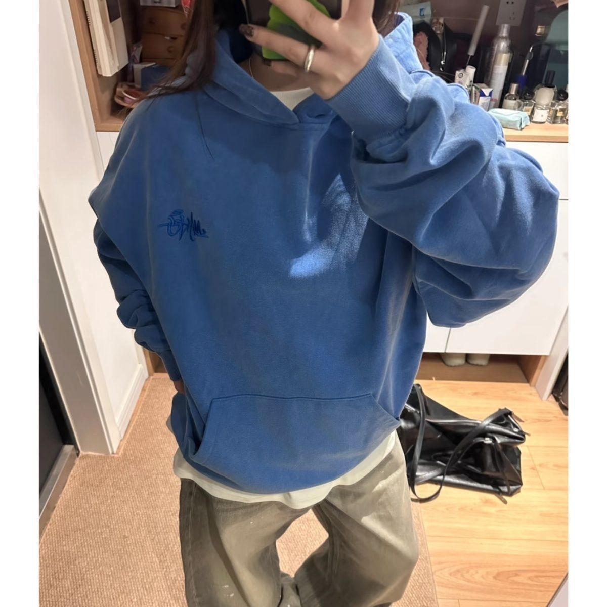 A stylish commuter-style sweatshirt crafted from soft cotton with long sleeves and a hood trimmed with silver fox fur. The relaxed fit ensures comfort and freedom of movement, while the washed finish with a letter/number print adds a unique, streetwear touch. Perfect for casual and everyday styling in blue.