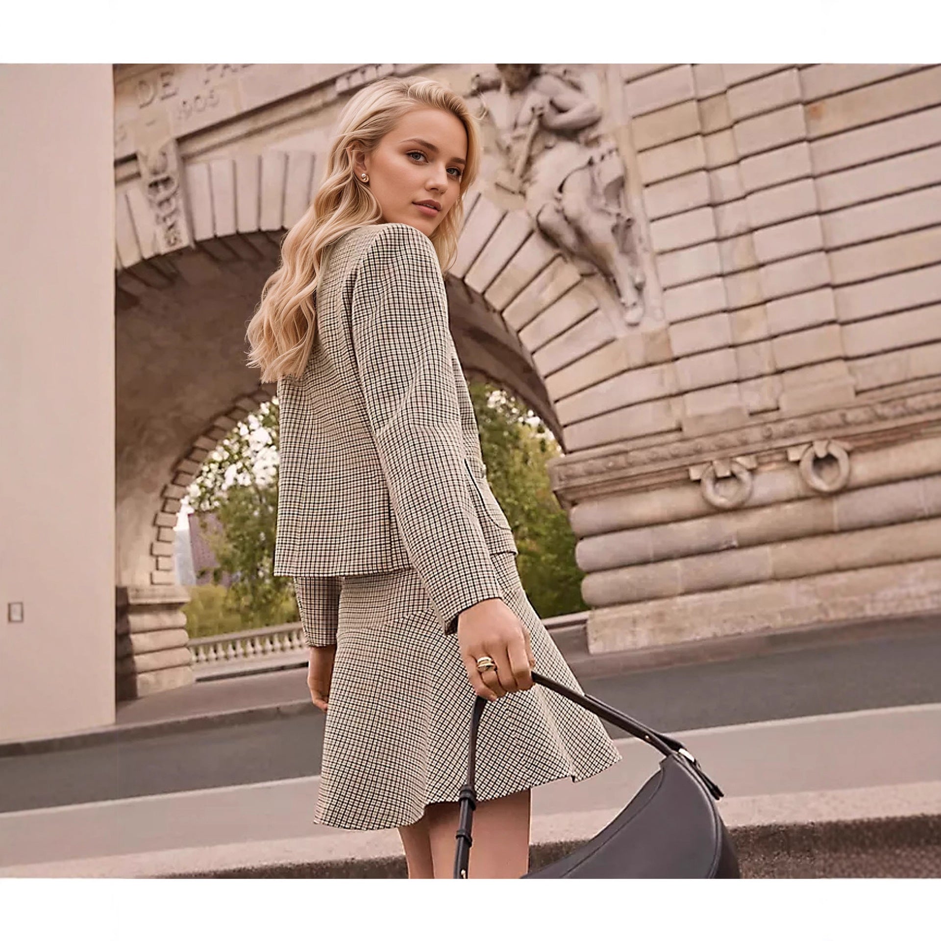 - Checkered pattern and collage/splicing details – a subtle, elegant accent
