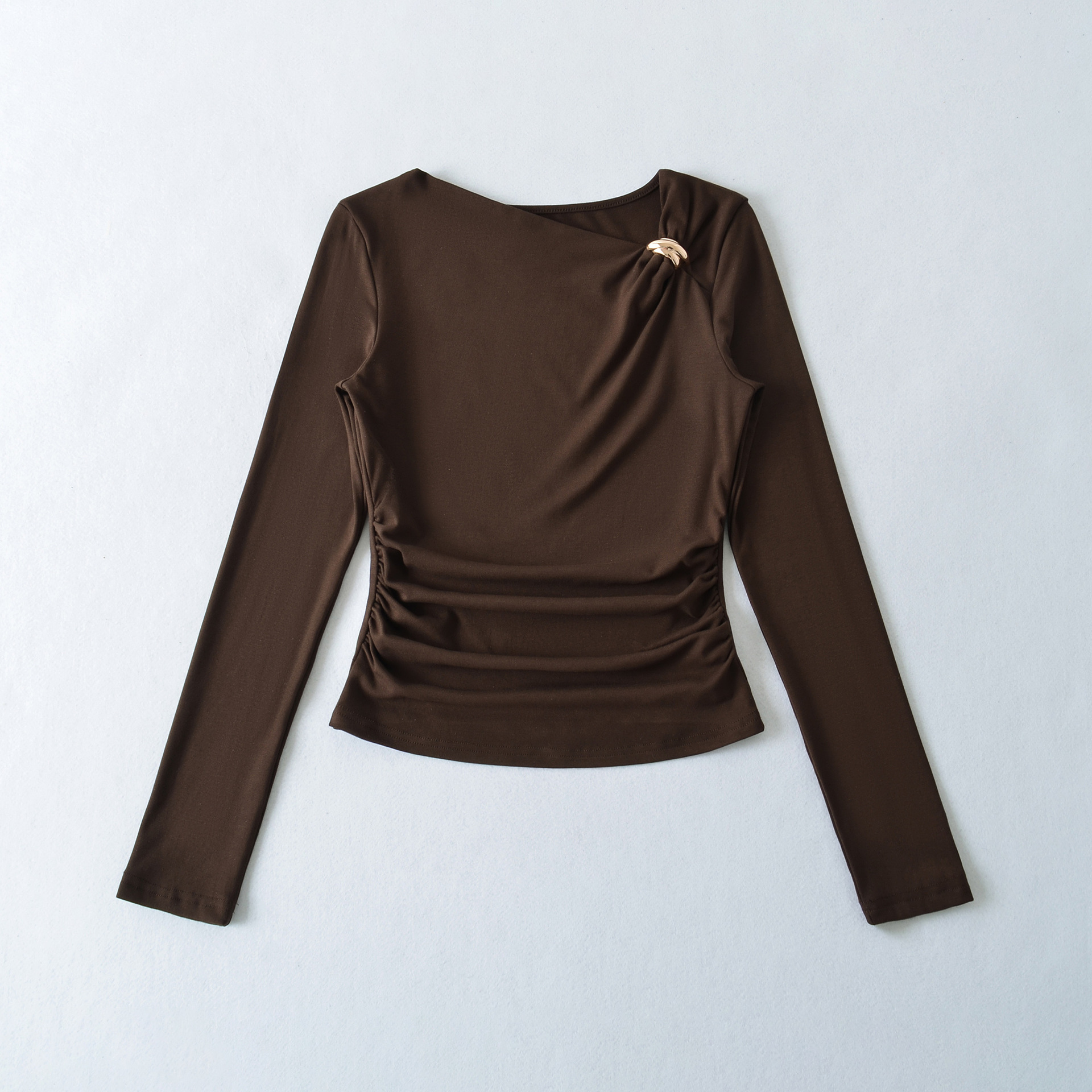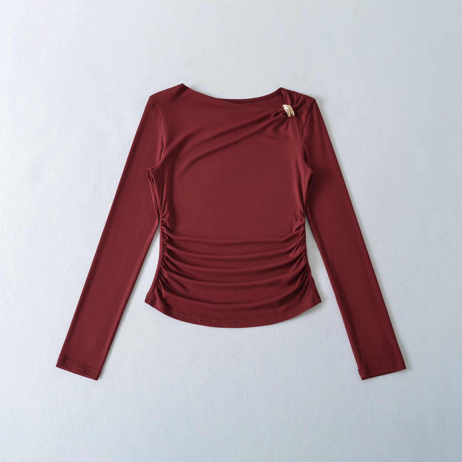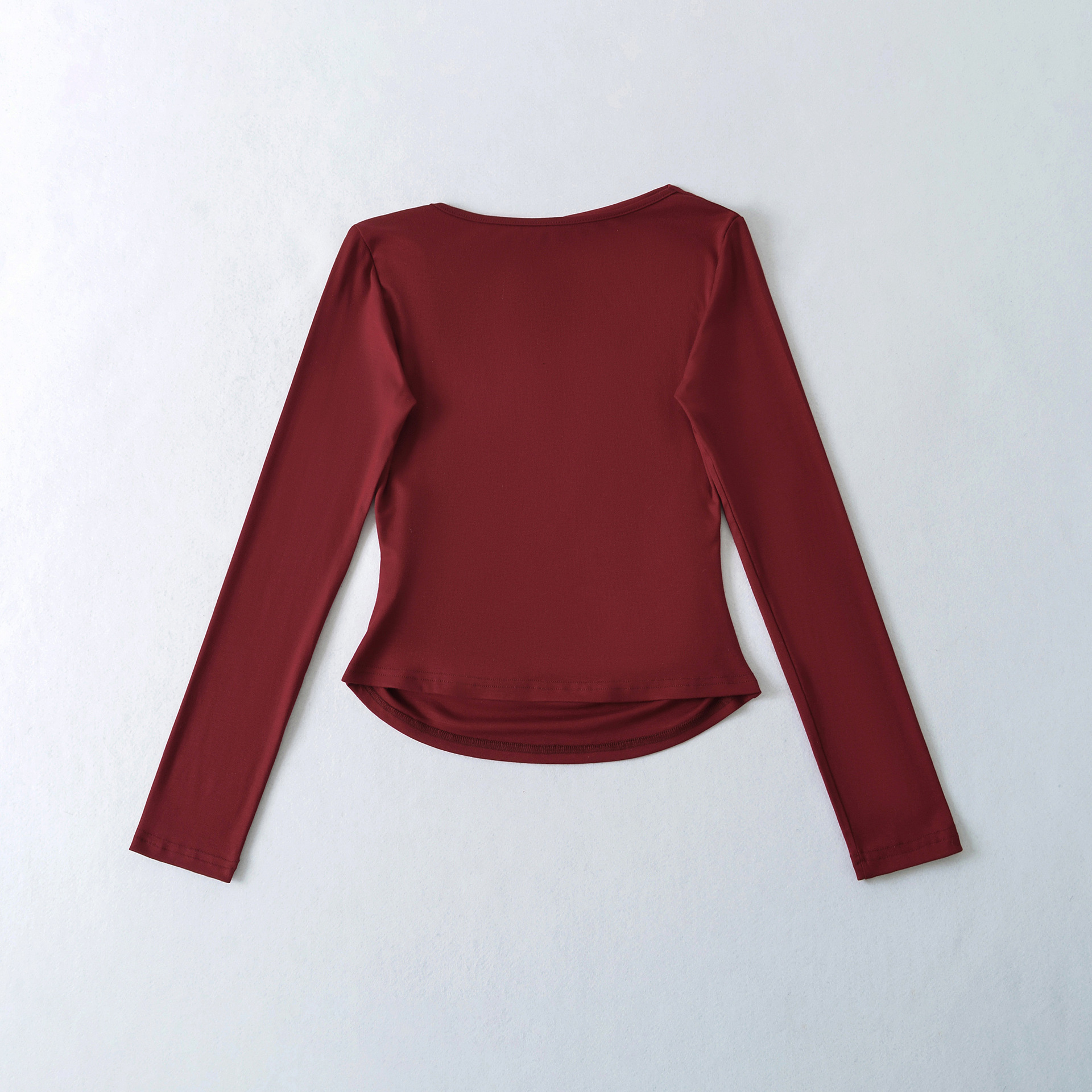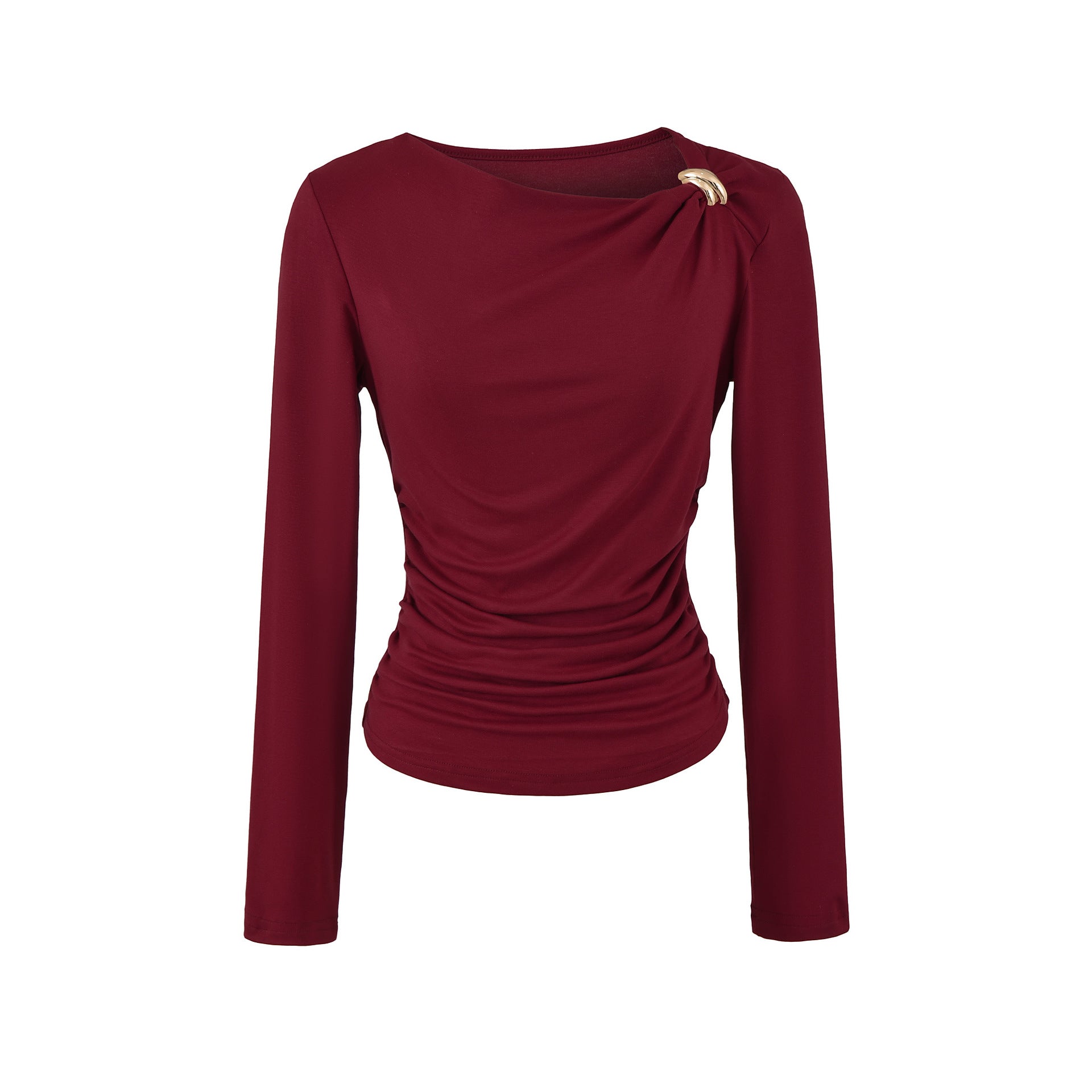 Elegancki top w stylu Elegant Commute, który łączy klasykę z komfortem. Prosty, jednolity wzór w klasycznych kolorach (czarny, bordowy, brązowy) sprawdzi się zarówno w codziennych stylizacjach, do pracy, jak i na spotkania towarzyskie. Kwadratowy dekolt podkreśla szyję i ramiona, a dopasowany fason slim fit i długi rękaw nadają sylwetce elegancki wygląd. Wykonany z elastycznej bawełny z dodatkiem spandexu mięki i komfortowy w noszeniu.